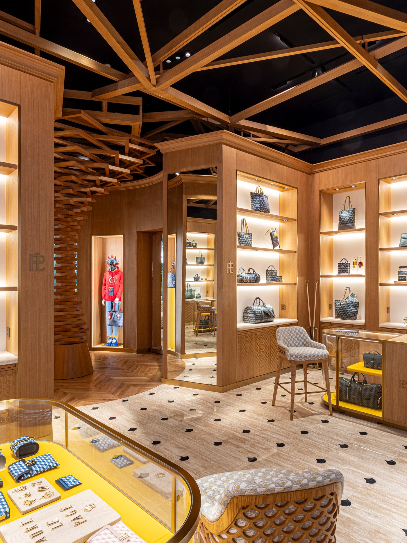 في هذا المشهد الاستوائي، تحتفي العناصر المعدنية والنباتية بغابة الجزر الغنّاء. تكريمًا لعالم الدار، تفتح الواجهة الزجاجية، المزينة بطبعة "سكيل كانفاس" الأيقونية، أبوابها إلى هذه المظلة الساحرة. أما الأرضية الرخامية الأنيقة، التي تحمل أيضًا النقشة المميزة، فتدعو الزائر إلى دخول عالم من الإغواء والجاذبية.